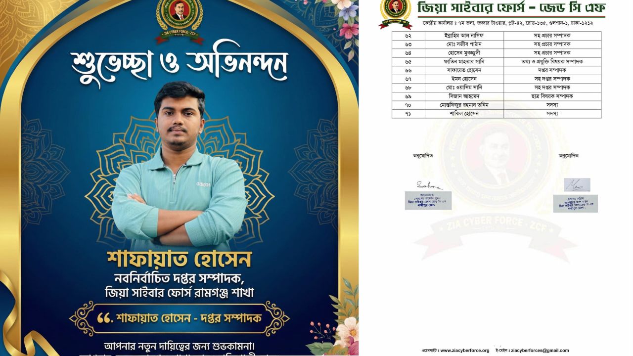 জিয়া সাইবার ফোর্স রামগঞ্জ শাখার নবগঠিত কমিটিতে দপ্তর সম্পাদক হিসেবে দায়িত্ব পেয়েছেন শাফায়াত হোসেন। সম্প্রতি সংগঠনের অনুমোদিত কাঠামোর আওতায় এই দায়িত্ব প্রদান করা হয়। দায়িত্ব গ্রহণের পরপরই শাখার নেতাকর্মী ও শুভানুধ্যায়ীদের পক্ষ থেকে তাঁকে শুভেচ্ছা ও অভিনন্দন জানানো হয়েছে।